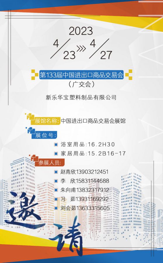 廣交世界,互利天下,新樂華寶塑料制品二期展位號:浴室用品16.2H30 /家居用品15.2B16-17